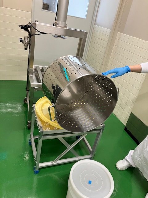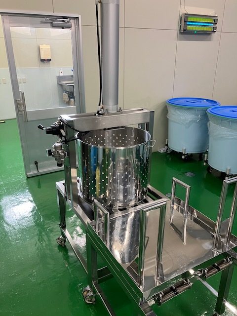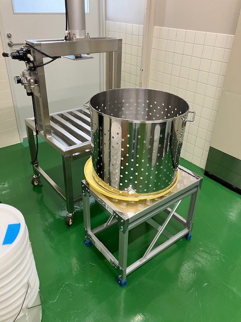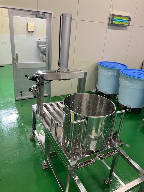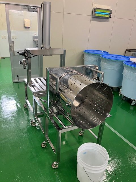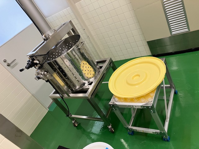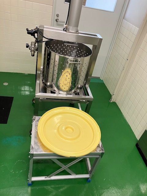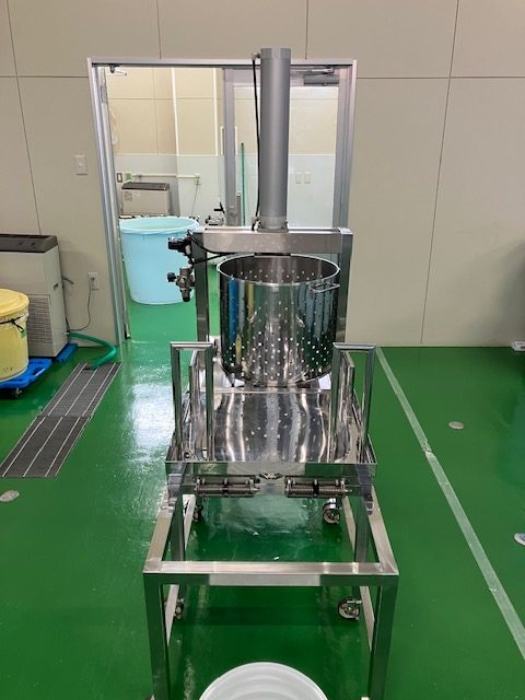 従来は、ステンレス製の寸胴を作業員が2人で持ち上げ、黄色のお盆に載せて作業を行っていました。