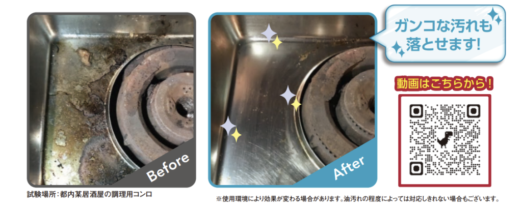 比較試験では業務用洗剤とほぼ同等レベルで油汚れをふき取ることが可能です。そのうえキャップがついておりますので、乾燥防止・長持ちしますので気になったタイミングでふき取り作業をすることができます