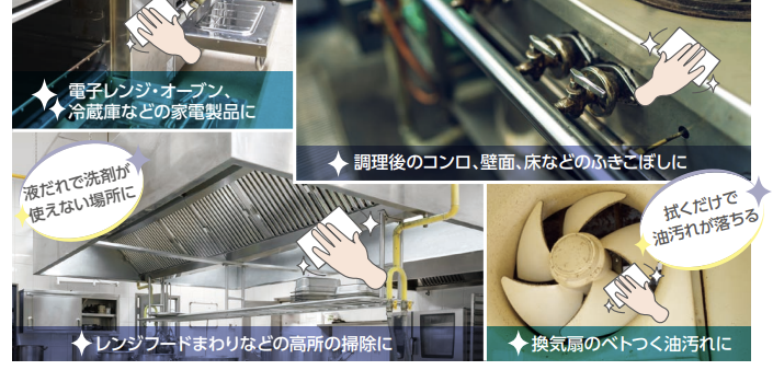 換気扇のベトつく油汚れ、電子レンジやオーブン、冷蔵庫などの家電製品は勿論、コンロ、床、レンジフードまわりなどの高所の掃除にも活躍